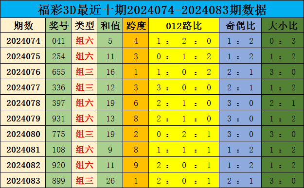 开奖回顾:第24083期福彩3D奖号为899,其中奖号012路比为2:0:1,大小比为3:0,奇偶比为2:1;