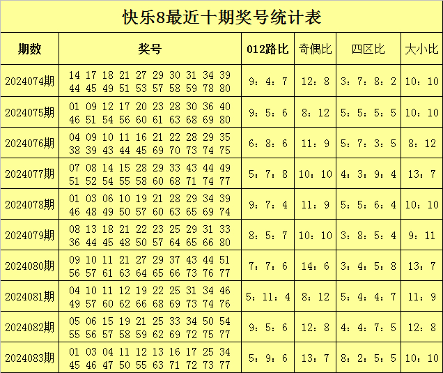 福彩快乐8第2024083期开奖回顾:01 03 04 11 12 13 16 17 25 34 45 46 47 50 55 63 71 72 73 77,其中奖号012路比为5:9:6,四区比为8:2:5:5奇偶比为13:7,大小比为10:10。