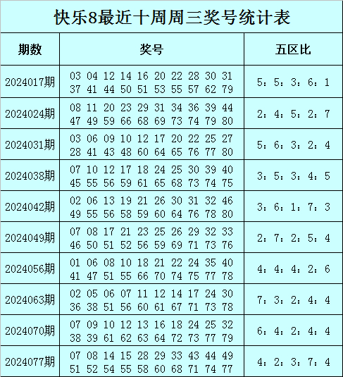 福彩快乐8第2024077期(上周三)开奖回顾:07 08 14 15 28 29 33 43 44 49 51 52 54 55 58 60 68 71 74 77,其中奖号五区比为4:2:3:7:4。