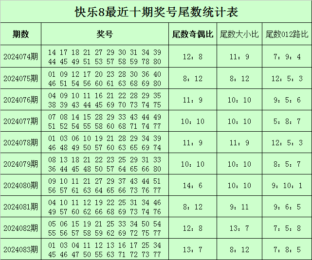 福彩快乐8第2024083期开奖回顾:01 03 04 11 12 13 16 17 25 34 45 46 47 50 55 63 71 72 73 77,其中奖号尾数012路比为7:8:5,尾数大小比为8:12,奇偶比为13:7。