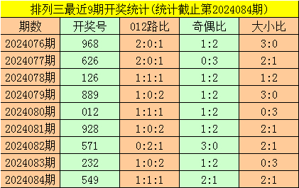 一、排列三第2024084期开出号码549,其奇偶比为2:1,大小比为2:1,号码012路比为1:1:1。该号码直选历史上出现了11次。