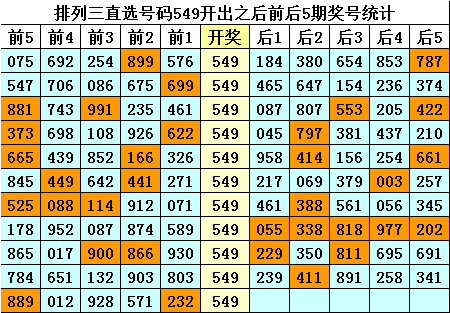 四、排列三直选号码549历史上开出11次,其前后五期奖号分别为: