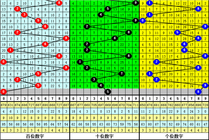 号码012路分析:在历年第085期开奖中,号码012路总比例为21:17:19,其中0路号码断档5期,1路号码断档4期,2路号码断档5期,本期012路比参考1:0:2。