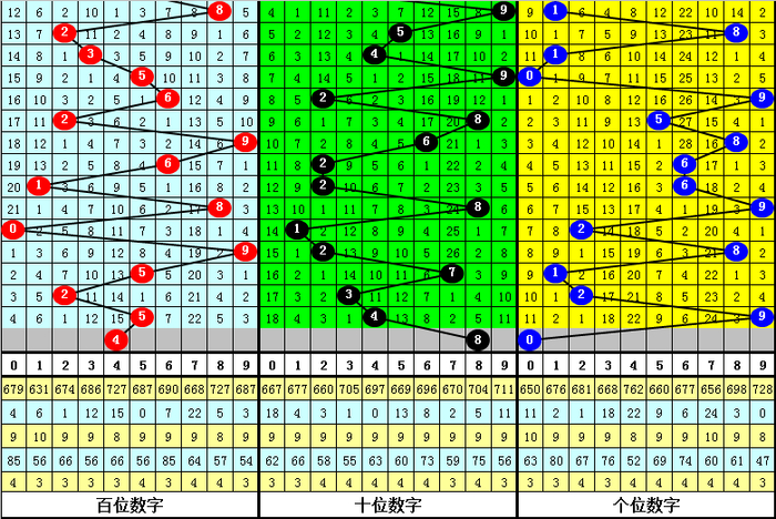 在连续10期开奖中,和值振幅分别为:2-8-9-5-16-22-16-6-6-11,开始上升,和值比较分散,本期预计和值小幅调整,出现在中部区域。