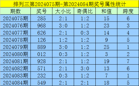 上期回顾:排列三第2024084期出现奖号549。开出组六,奇偶比2:1,012路比1:1:1,大小比2:1,和值18,跨度5。