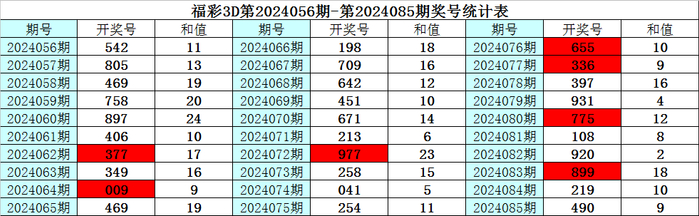上期回顾:福彩3D第2024085期奖号为:490,其中奖号组选类型为:组六,奇偶比为1:2,大小比为1:2,012路比为2:1:0,和值为13,跨度为9。