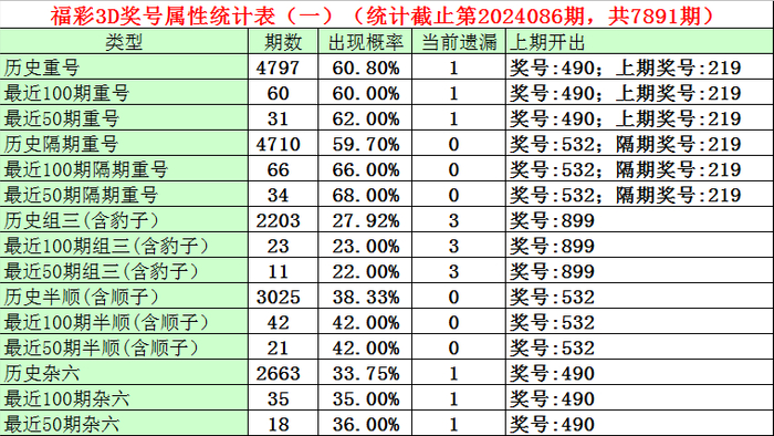 福彩3D第2024084期奖号为219,第2024086期奖号为532,隔期奖号出号2。从统计表中分析,最近100期隔期奖号出现66期,出现比例为66%,最近50期隔期奖号出现34期,出现比例为68%,最近10期隔期奖号出现 7期,出现比例为70%,本期防止试机号中号码轮空。