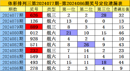 开奖回顾:排列三第2024086期奖号为:278,各位号码遗漏值分别为2、3、4,遗漏总值为9。