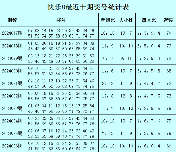福彩快乐8第2024086期开奖回顾:09 10 12 19 21 24 26 31 35 37 41 50 51 52 56 60 63 64 71 78,其中奖号奇偶比开出10:10,大小比开出10:10,四区比开出4:6:6:4,跨度开出69。
