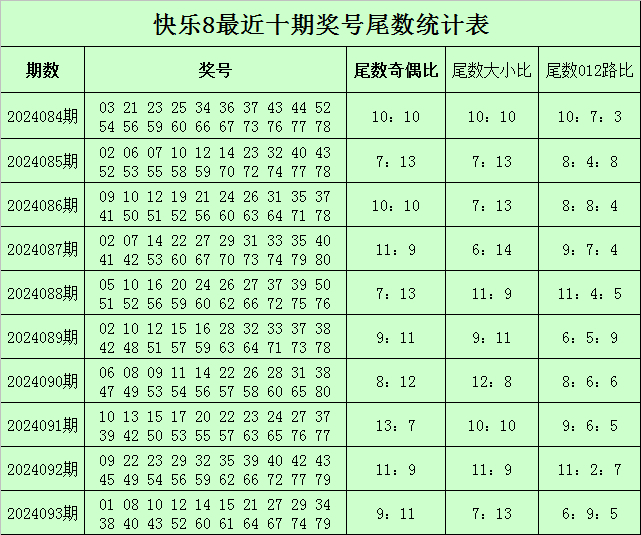 福彩快乐8第2024093期开奖回顾:01 08 10 12 14 15 21 27 29 34 38 40 43 52 60 61 64 67 74 79,其中奖号尾数012路比为6:9:5,尾数大小比为7:13,奇偶比为9:11。