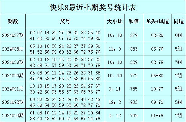 福彩快乐8第2024093期开奖回顾:01 08 10 12 14 15 21 27 29 34 38 40 43 52 60 61 64 67 74 79,其中奖号大小比开出8:12,和值为749,跨度为78,包含7组同尾号:10 40 60、01 21 61、12 52、14 34 64 74、27 67、08 38、29 79。
