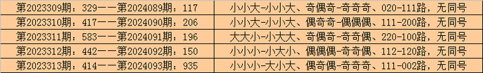 在排列三历史开奖中,第2023309期-第2023313期连续5期奖号为:329-417-583-442-414。