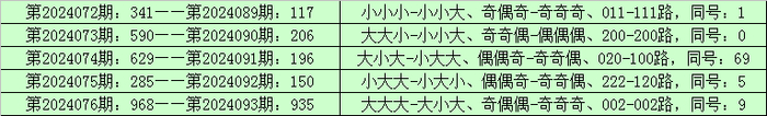 统计排列三已开出的奖号发现,在连续5期(第2024072期-第2024076)奖号为:341-590-629-285-968。
