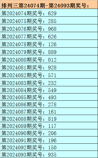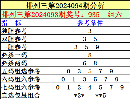 1.排列三最近十期分别开出号码:549-493-278-161-819-117-206-196-150-935,其中有6期奖号开出了上期的重复号码,本期预计第2024093期奖号:935中有重号,参考号码:3。