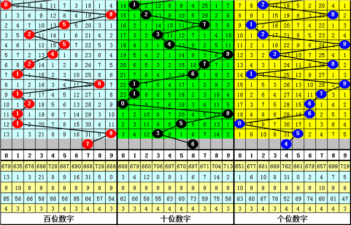百位号码奇偶比为3:4,奇数走势较冷,本期看好奇数出现;大小比为2:5,大号走势较冷,本期预计开出大号。