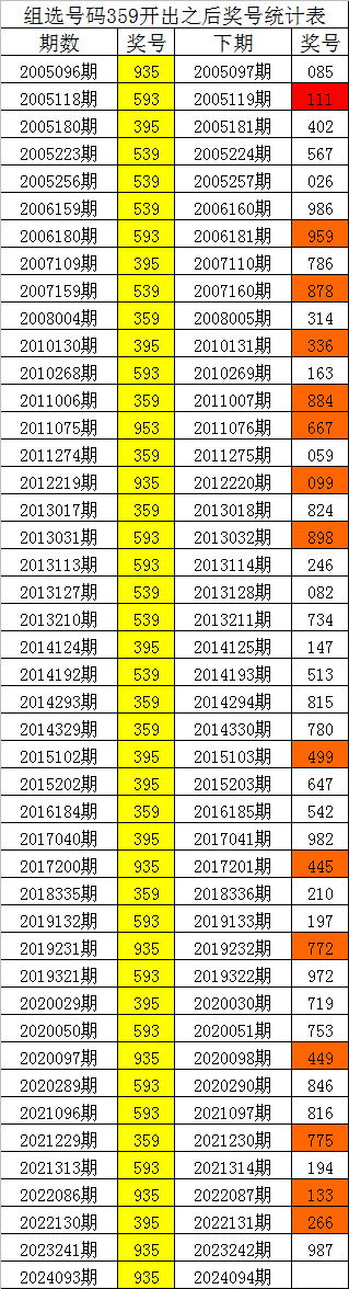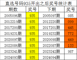 从上表统计可以看出,直选号码935开出之后,其下期奖号: