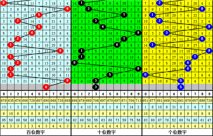百位分析:该位上期开出号码9,最近10期该位012路比为1:5:4,其中0路号码间隔11期再次出现,本期该位防0路号码再次出现,参考号码6。