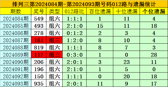 开奖回顾:排列三第2024093期奖号为:935,类型为组六,号码012路比为2:0:1,百十个位号码直选分别遗漏11期、9期和17期。