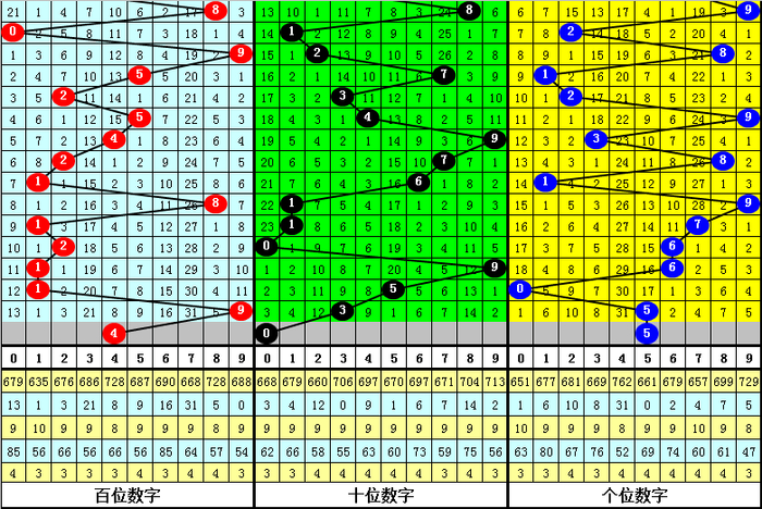 3、在以上0-9号码频次中,号码012路比为30:15:27,奇偶比为28:44,本期预计百位开出偶数号码,参考号码4。