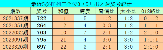 1、排列三前两期个位分别开出号码0和5,历史上个位号码连续两期分别出现0和5时,共有52次。在最近5次出现时,其下期分别出现号码:722、264、703、795、697;