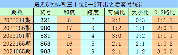 1、最近两期排列三十位号码开出号码分别为5和3,历史上十位号码连续两期同时出现号码5和3的奖号共开出67期。最近五次下期开出号码为:321、980、531、853、903;