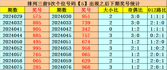 个位号码:上期奖号为大号、奇数、2路号码:5,历史上个位号码5共开出661期,前一次出现在第2024075期,上期遗漏17期再出。