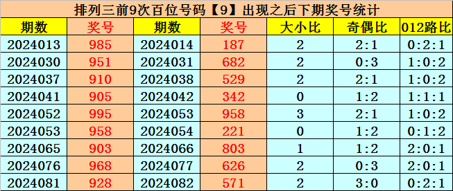百位号码:百位上期奖号为0路、奇数、大号:9,历史上百位号码9共开出688期,前一次开出期数在第2024081期,上期奖号隔11期再次开出。