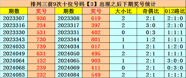 在十位前9次出现号码3后,其下期奖号分别开出:1-9-0-0-1-9-0-1-4,其中奖号个数大小比是2:7,012路比是5:4:0,奇偶比是5:4。