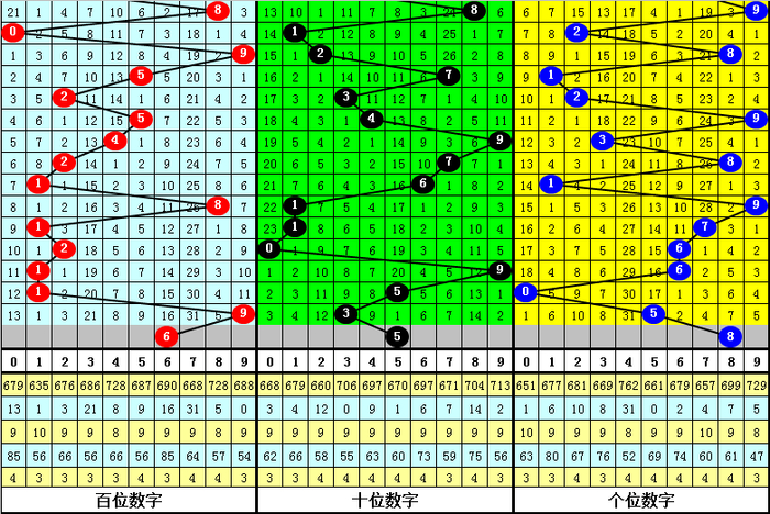 在百位前9次出现号码9之后,下期百位分别开出奖号:1-6-5-3-9-2-8-6-5,其中开出号码个数大小比是6:3,012路比是4:1:4,奇偶比是5:4。