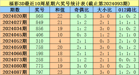 福彩3D第2024087期(上周星期六)奖号为797。其中奖号奇偶比为3:0,大小比为3:0,012路比为1:2:0。