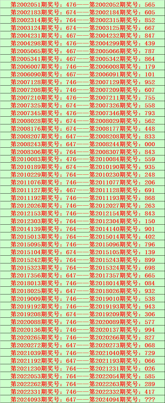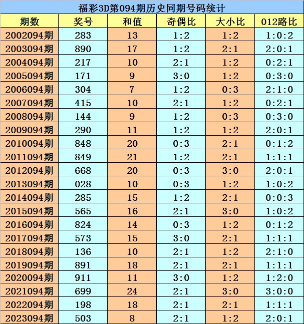 福彩3D第2024094期开奖日期:2024年4月13日,历史上第094期已开出了22次奖号,历年同期号码分别为:283、890、217、171、304、415、144、290、848、849、668、028、285、565、824、573、136、891、911、699、198、503。