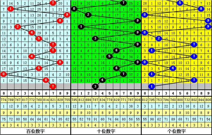 其中,组三出现7次,组六出现15次,单选0-9分别开出: