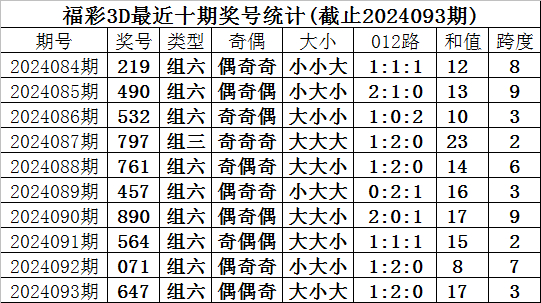 开奖回顾:福彩3D第2024093期奖号为647,奖号形态为:组六、大小大、1:2:0、偶偶奇。