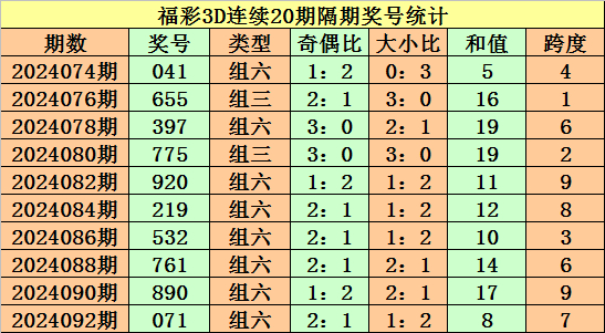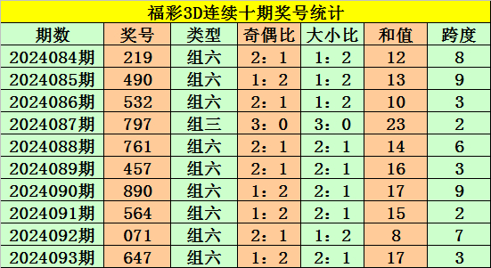 上期回顾:福彩3D第2024093期奖号:647。组六、大小大、偶偶奇。