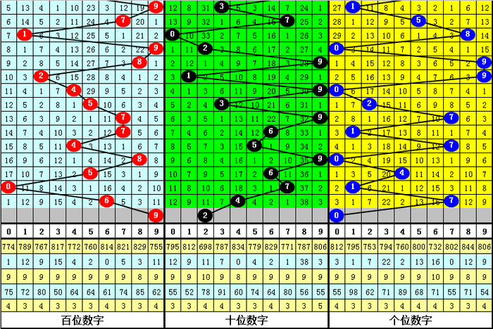 百位:2024089期-2024093期出号:48506,振幅为8点,分布比较分散,本期预计百位走大,参考9。