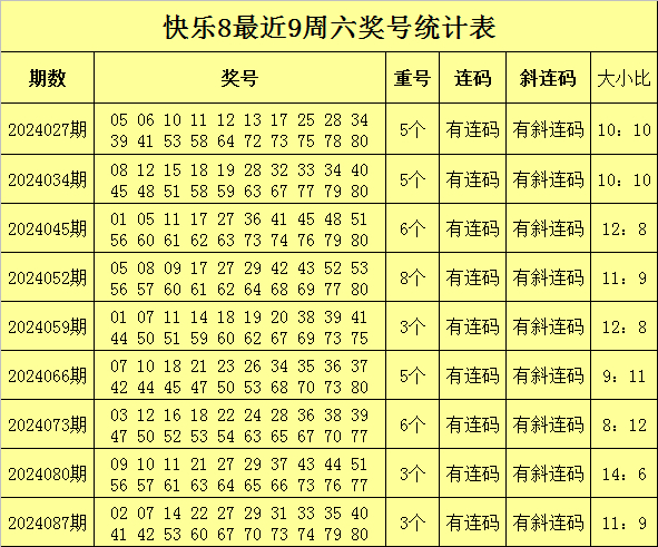 福彩快乐8第2024087期(上周六)奖号回顾:02 07 14 22 27 29 31 33 35 40 41 42 53 60 67 70 73 74 79 80,其中大小比为10:10,包含3个重号27、29、73,包含连码40 41 42、73 74、79 80。
