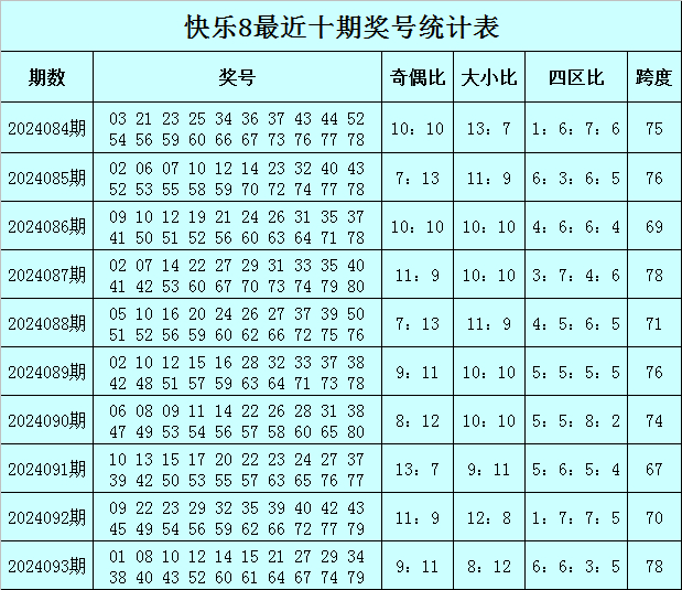 福彩快乐8第2024093期开奖回顾:01 08 10 12 14 15 21 27 29 34 38 40 43 52 60 61 64 67 74 79,其中奖号奇偶比开出9:11,大小比开出8:12,四区比开出6:6:3:5,跨度开出78。