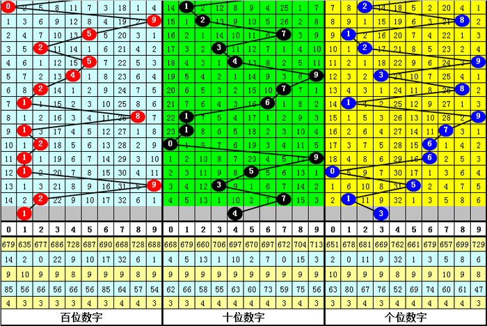 第三位开奖1在最近三次之后,下期落号分别为:0-2-9,奖号出现在:冷号区段、热号区段、热号区段,本期看好第三位在热号区段出现,排除冷号区段5码:01457。