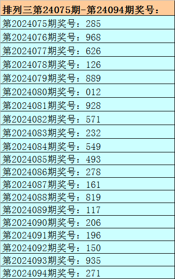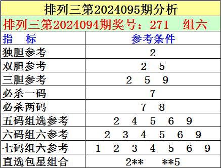 1.排列三最近十期分别开出号码:493-278-161-819-117-206-196-150-935-271,其中有6期奖号开出了上期的重复号码,本期预计第2024094期奖号:271中有重号,参考号码:2。