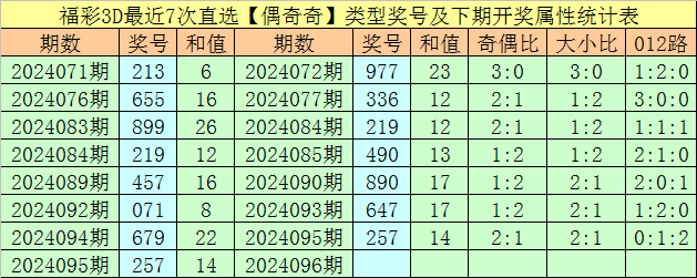 开奖回顾:福彩3D第2024095期开奖号码为257,奖号直选类型为:偶奇奇、小大大和221路。