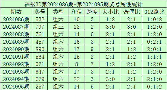 开奖回顾:福彩3D第2024095期开奖号:257,其中奖号和值:14,奇偶比2:1,大小比2:1。