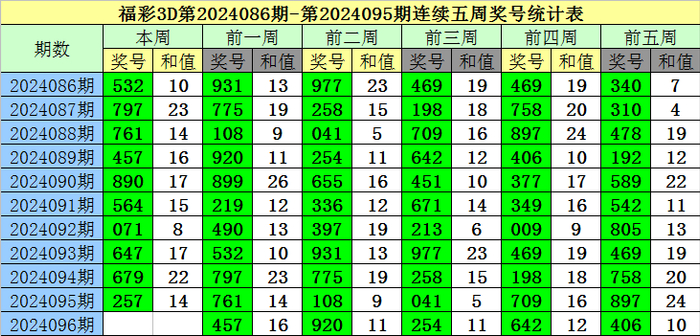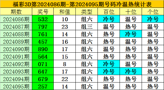上期回顾:福彩3D第2024095期开奖奖号为:257,奖号类型为:组六,奖号冷温热态为:温号+热号+热号。