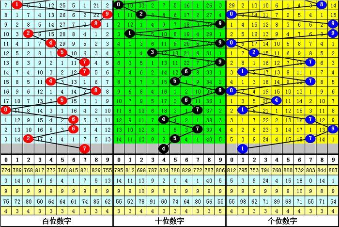 百位上期出现:温号2,该位连续十期以热号出现较多,以温号、冷号出现较少,本期该位温号有4个:1、4、7、9,看好温号转热,关注号码7。
