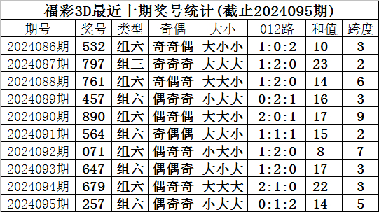 开奖回顾:福彩3D第2024095期奖号为257,奖号形态为:组六、小大大、0:1:2、偶奇奇。