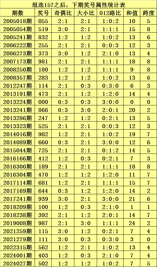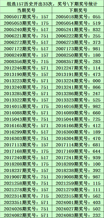 二、组选157分析:排列三历史上已开出33次组选号码157了,其奖号和下期开出奖号统计如下:
