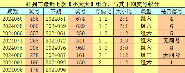 奖号类型分析:排列三最近七次【小大大】组合与【奇奇奇】组合出现之后,其下期组三号码开出3次,组六号码开出11次,其中组六号码开出频率非常热,本期预计继续开出组六号码。另外,其下期有5期没有出现重号,本期不看好开出重号。