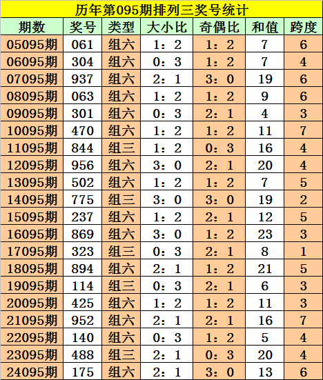 排列三第2024095期奖号:175,和值13,跨度6,大小比2:1,奇偶比3:0。