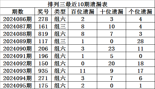 上期回顾:排列三第2024095期奖号:175,组六,直选遗漏总值为3期。