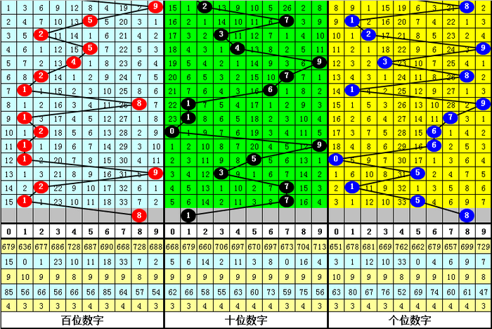 百位:上期开出1,近10期012路比为1:5:4,其中1路号遗漏2期再出,本期放弃1路号,关注2路号,看好8。