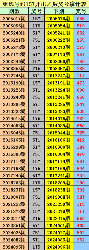 排列三组选157出现之后下期分别开出:055、519、832、255、373、981、180、283、114、473、000、866、247、525、982、660、725、412、189、470、681、644、939、100、392、987、115、111、562、403、502、232。